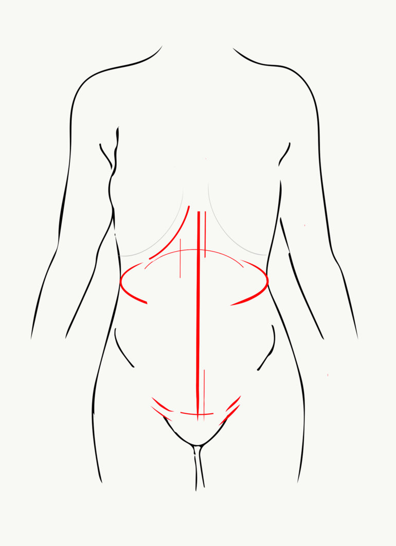 - Dans le cadre d’une chirurgie exploratrice, les incisions médianes ou paramédianes peuvent s’étendre sur toute ou une partie de la ligne blanche