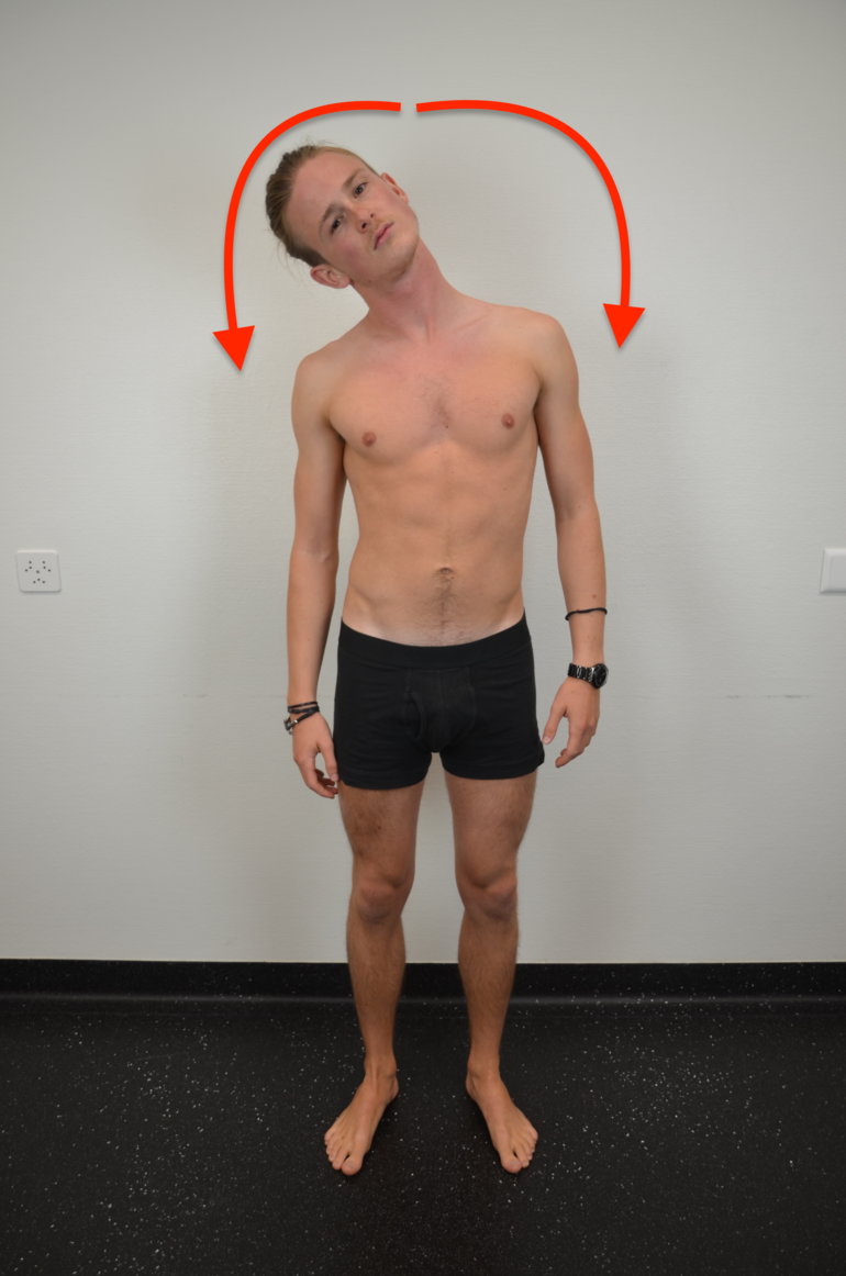On demande au patient de se pencher à gauche et à droite (inclinaisons latérales) ainsi que de s’étendre en arrière. Si le patient a de la peine de garder le bassin droit lors de l’inclinaison latérale, on peut l’aider en stabilisant son bassin.