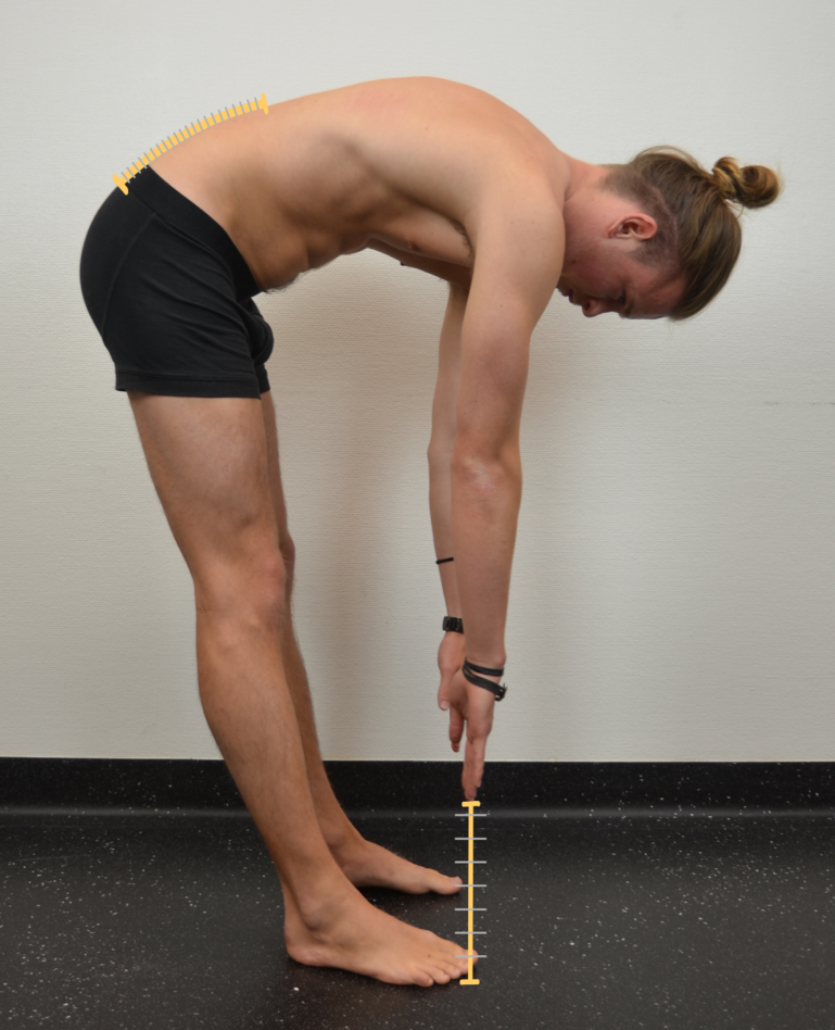 Pour évaluer la flexion du tronc, on procède au test de Schober ainsi qu’au test de la distance doigts-sol.