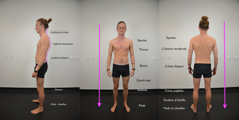 - les courbures de la colonne ainsi que la position des genoux (hyperextension, hyperflexion). Les courbures physiologiques de la colonne vertébrale sont lordose (cervicale) – cyphose (thoracique) – lordose (lombaire).