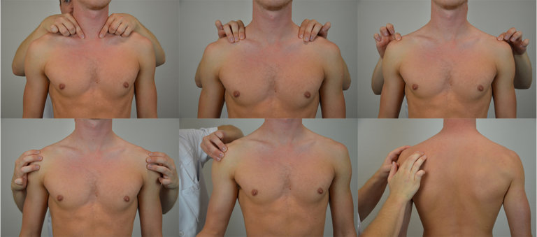 La palpation se fait de manière symétrique en palpant systématiquement les différentes structures anatomiques. On palpera l’art. sterno-claviculaire, la clavicule, l’articulation acromio-claviculaire, acromion, processus coracoïde, scapula avec épine scapulaire, la tête humérale et la gouttière bicipitale. On recherchera les zones douloureuses, les déformations, les voussures, etc.