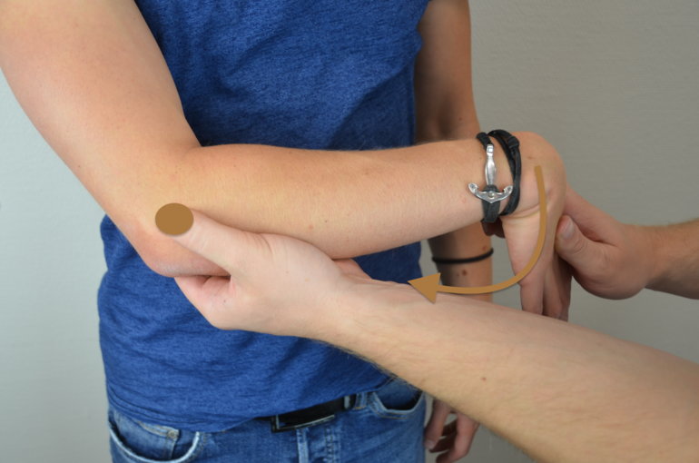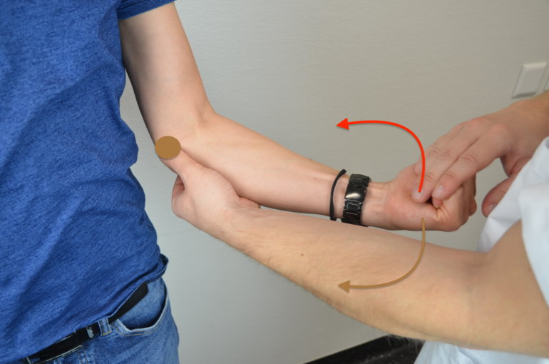 L’examinateur palpe l’épicondyle latéral tout en amenant le poignet en pronation, flexion et le coude en extension. C’est ce qu’on appelle le test de Mill.