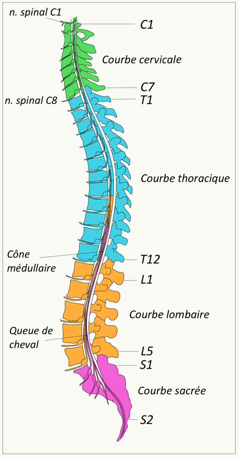 La colonne vertébrale, ou rachis, est la partie du squelette axial qui relie le bassin à la tête. Le rachis est composé de 33 vertèbres, qui sont unies entre elles au moyen d’articulations, c’est-à-dire les disques intervertébraux et articulations postérieures, au moyen de muscles et de ligaments. On le divise en 3 parties mobiles et deux blocs osseux. Les 3 parties mobiles sont le rachis cervical, composé de 7 vertèbres cervicales, le rachis thoracique ou dorsal, composé de 12 vertèbres thoraciques ou dorsales et le rachis lombaire, composé de 5 vertèbres lombaires. Les deux blocs osseux sont représentés par le sacrum et le coccyx. Le sacrum est composé de 4 vertèbres fusionnées, donc sans disques et sans ligaments. Le coccyx est un reliquat de queue, aussi composé de 3-5 vertèbres fusionnées.