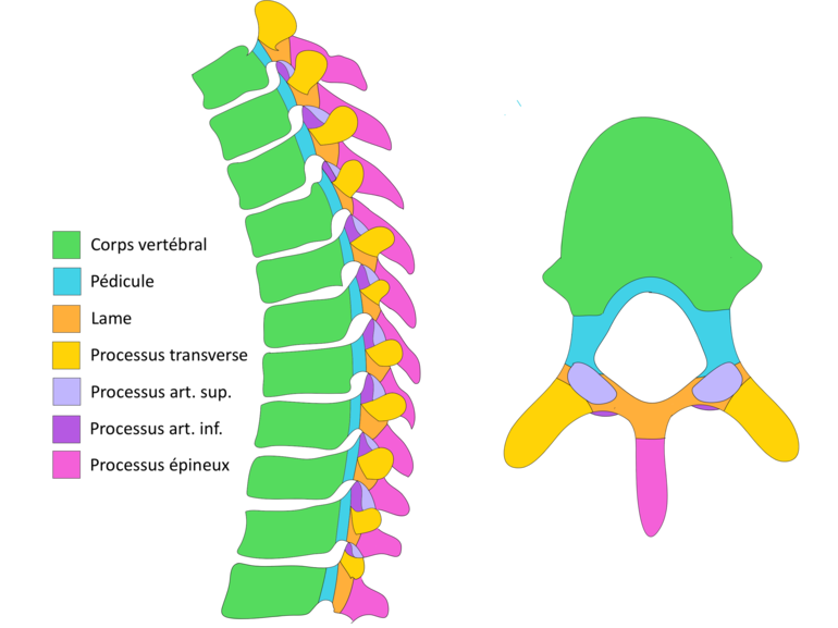 Anatomiquement, une vertèbre est constituée du corps vertébral, des pédicules, des apophyses articulaires supérieures et inférieures, de l’isthme, des lames gauche et droite, de l’apophyse épineuse et des apophyses transverses. Bien évidemment, la structure exacte peut varier en fonction de la partie du rachis auquel fait partie la vertèbre en question, les deux premières vertèbres cervicales ainsi que le sacrum sont constituées encore de manière différente. Le complexe disco-ligamentaire qui permet l’articulation entre deux vertèbres est constitué du disque intervertébral, des capsules articulaires ainsi que des ligaments longitudinaux antérieur, longitudinal postérieur, jaune, inter-épineux et supra-épineux.