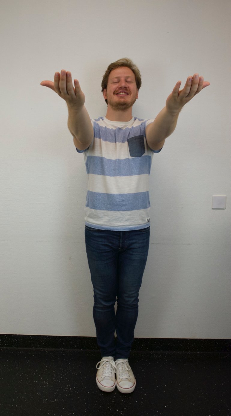 On demande au patient de se mettre debout, pieds joints avec bras tendus devant lui, paumes à plat tendues vers le haut. On observe une pronation de l’avant-bras, un creusement des paumes de main. On pense à une atteinte pyramidale.