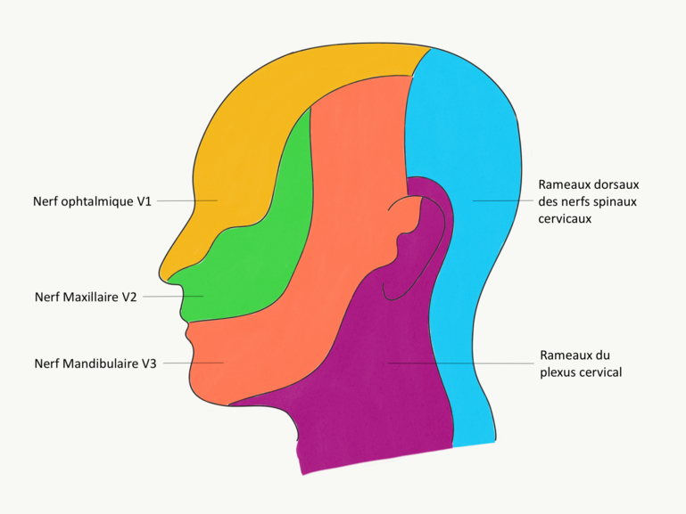 Le nerf trijumeau est composé de 3 branches, le nerf ophtalmique (V1) sensitif, le nerf maxillaire (V2) sensitif et le nerf mandibulaire (V3) sensitif et moteur.