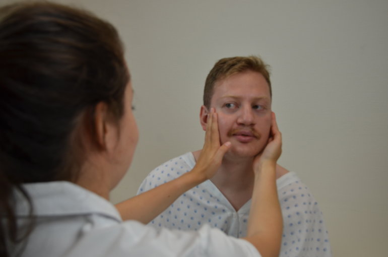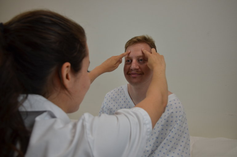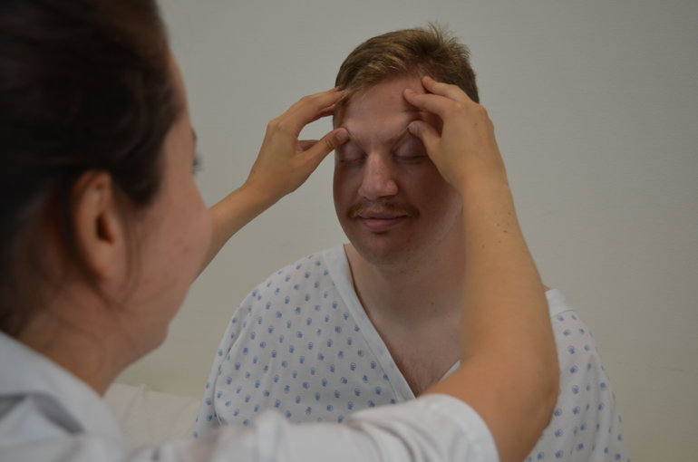 Pour ce faire, on demande au patient de froncer puis hausser les sourcils, de fermer fort les yeux, de gonfler les joues, de sourire. On observe une asymétrie de contraction avec un déficit unilatéral du front et une incapacité à fermer les yeux, sans dissociation automatico-volontaire. On pense à une atteinte périphérique. En cas d’atteinte faible, les cils de l’œil du côté paralysé vont paraître plus longs en raison d’une moindre fermeture. On parle du signe des cils de Souques.
