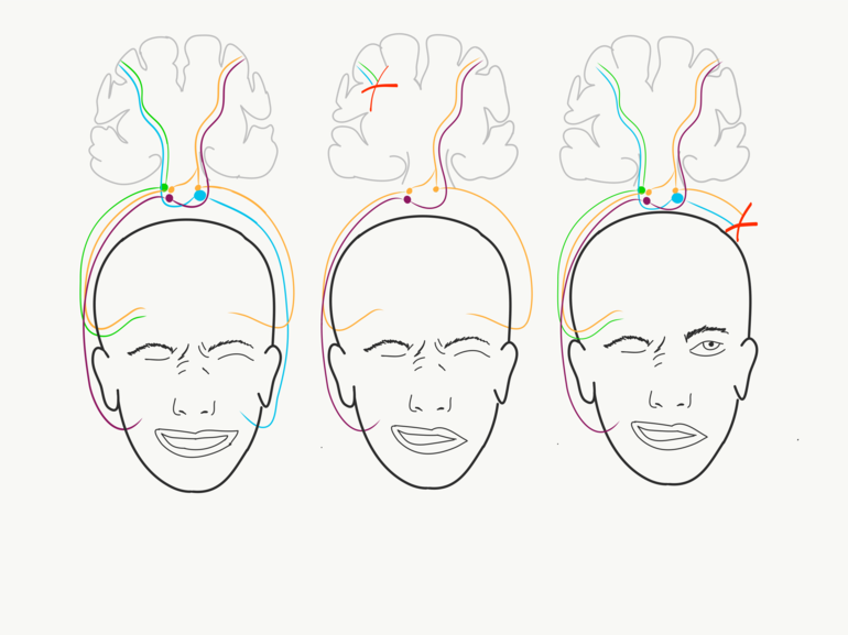 On examine un déficit sensitif ou moteur d’une branche. On pense à une atteinte périphérique, zona ophtalmique, chirurgie orale, tumeur, etc. On observe une atteinte sensitive de plusieurs branches avec un hémisyndrome sensitif. On pense à une atteinte centrale.