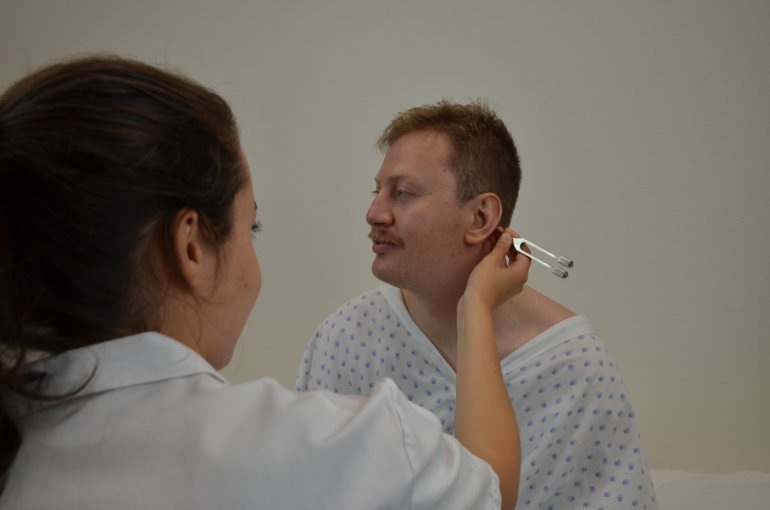 On débute par un examen de l’audition. On réalise premièrement un dépistage grossier. On frotte les doigts les uns contre les autres à proximité du pavillon gauche du patient puis à droite et finalement simultanément à gauche et droite. On constate une surdité bilatérale ou unilatérale. On identifie une asymétrie d’audition, on pense à une surdité unilatérale, une hypoacousie bilatérale ou unilatérale. On pense à une surdité de transmission ou de perception.