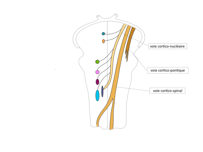 Nous possédons 12 paires des nerfs crâniens répartis dans la tête et le cou, chacun portant son numéro, son nom et chacun ayant des fonctions spécifiques. Les fibres cortico-nucléaires originaires des hémisphères décussent (la décussation désigne le croisement des fibres nerveuses au-delà de la ligne médiane pour rejoindre le côté contralatéral) au niveau du tronc cérébral pour rejoindre leur noyau crânien respectif. Les nerfs crâniens émergents de ces noyaux se dirigent vers leurs cibles ipsilatéralement. Un déficit hémisphérique s’exprime controlatéralement à la lésion. Un déficit supranucléaire du tronc s’exprime controlatéralement à la lésion. Un déficit nucléaire du tronc s’exprime ipsilatéralement à la lésion.