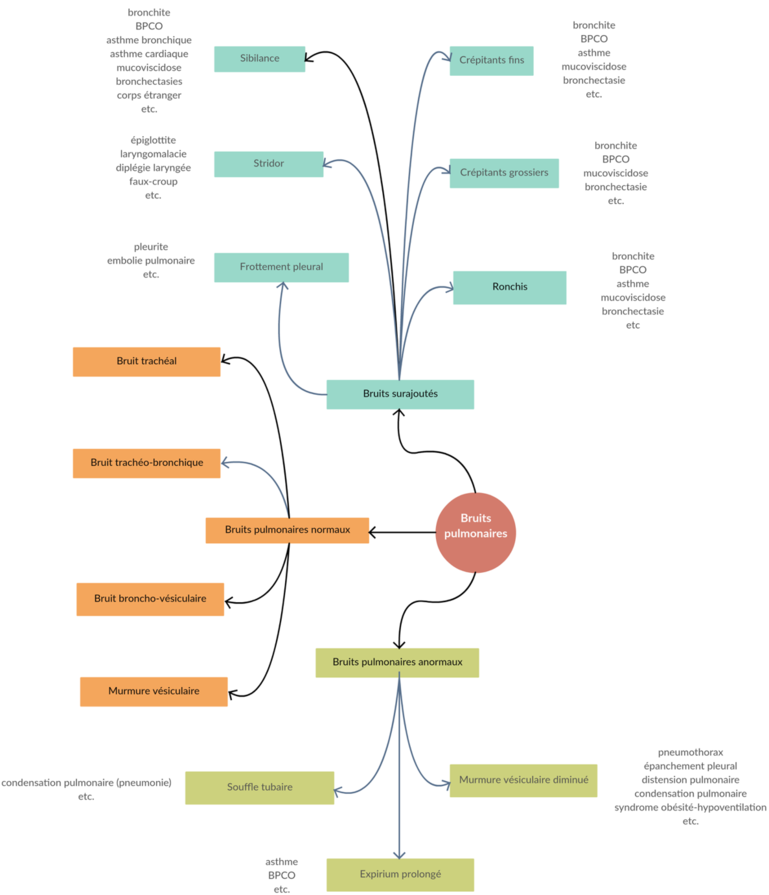 On demande au patient de respirer un peu plus fort avec la bouche ouverte afin de faciliter l’auscultation. L’auscultation se fait systématiquement sur un cycle complet comprenant inspiration et expiration. L’inspiration a une durée plus importante que l’expiration en situation physiologique. On décrit deux types de bruits, ceux respiratoires obligés et ceux surajoutés, adventitiels.