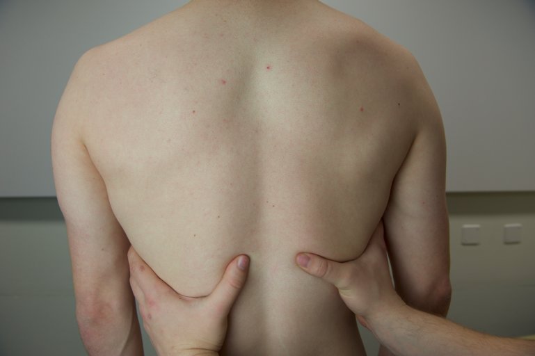 On débute par une palpation de toute zone douloureuse ou anomalie remarquée à l’inspection. On déclenche des douleurs à la palpation qui sont en faveur d’une atteinte musculosquelettique, d’une embolie pulmonaire, d’une crise d’occlusion des vaisseaux dans le cadre d’une drépanocytose, etc. Certaines manœuvres, non détaillées ici, permettent de reproduire une douleur musculosquelettique spécifique : crowing rooster maneuver, horizontal arm flexion, hooking maneuver, etc.
