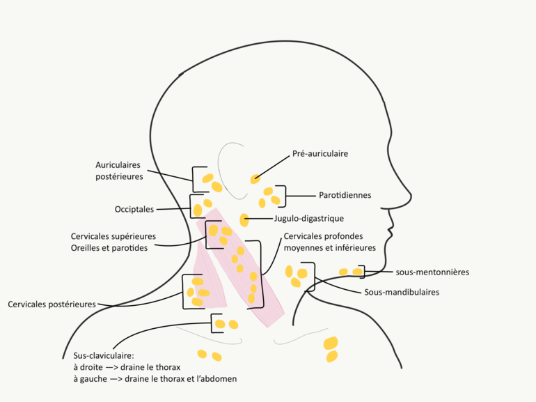 On palpe une masse isolée, solide, fixée au plan profond et indolore, on pense à une masse ou adénopathie tumorale. On palpe des masses multiples ou uniques, molles ou fluctuantes, libres et douloureuses, on pense à une adénopathie infectieuse, inflammatoire ou à un abcès. On palpe une masse sus-claviculaire, on pense à une adénopathie maligne.
