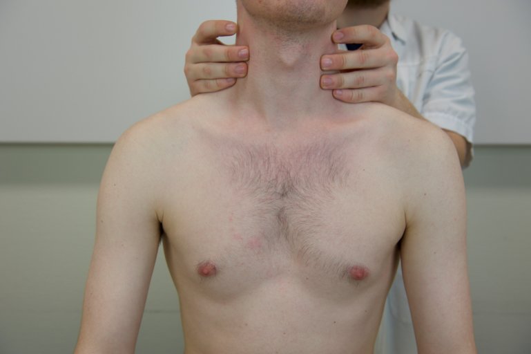 On poursuit par une palpation en profondeur des ganglions sus-claviculaires, cervicaux antérieurs et postérieurs, submandibulaires, submentonniers, occipitaux, postauriculaires, préauriculaires, parotidiens et axillaires (avec des gants).