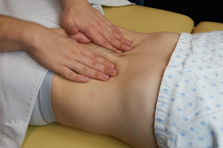 On distingue la palpation superficielle et la palpation profonde. En cas de résistance, on essaie de détendre le patient. On peut lui demander de respirer par la bouche, mâchoire tombante. Le muscle grand droit de l’abdomen est plus détendu en expiration.