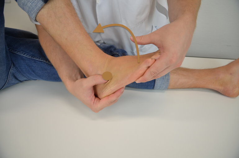 L’examinateur maintient le pied à l’aide d’une main en position anatomique standard pendant que l’index de l’autre main percute la zone inférieure et postérieure à la malléole interne. Lors de ce geste, le patient décrit les paresthésies déjà ressenties au niveau de la face plantaire du pied. On pense à une compression du nerf tibial dans le cadre d’un syndrome du tunnel tarsien postérieur.