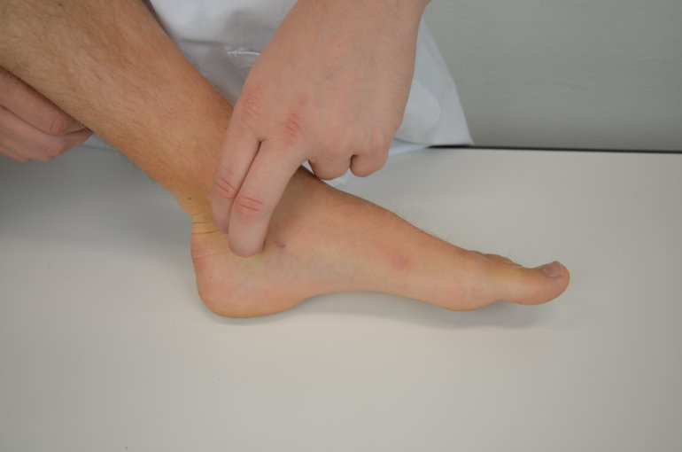 Lors de l’examen clinique, on a mis en évidence une paresthésie au niveau de la face dorsale ou plantaire du pied ainsi qu’une diminution de la force. On a évoqué plusieurs diagnostics dont le syndrome du tunnel tarsien. Pour rechercher un tunnel tarsien, on effectuera la percussion du test de Tinel.