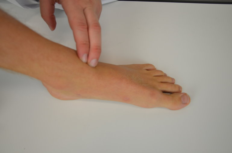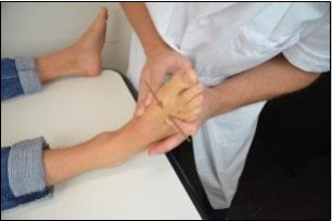 Parallèlement, l’examinateur comprimera l’avant-pied en exerçant une pression traversant les têtes métatarsiennes. Lors de ce geste, l’examinateur ressent un « clic » ou le patient décrit une douleur au niveau de l’espace intermétarsien testé. On pense à une névralgie de l’espace entre le 2e et le 3e ou entre le 3e et 4e métatarsien, appelé aussi névrome de Morton.