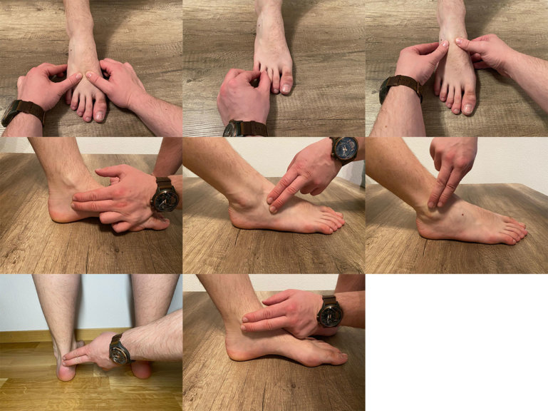 Figure 7 : De gauche à droite en commençant depuis le haut, palpation du tarse, des phalanges, du métatarse, du ligament deltoïde, du complexe ligamentaire externe, de la malléole externe, du tendon d'Achille et de la malléole interne |