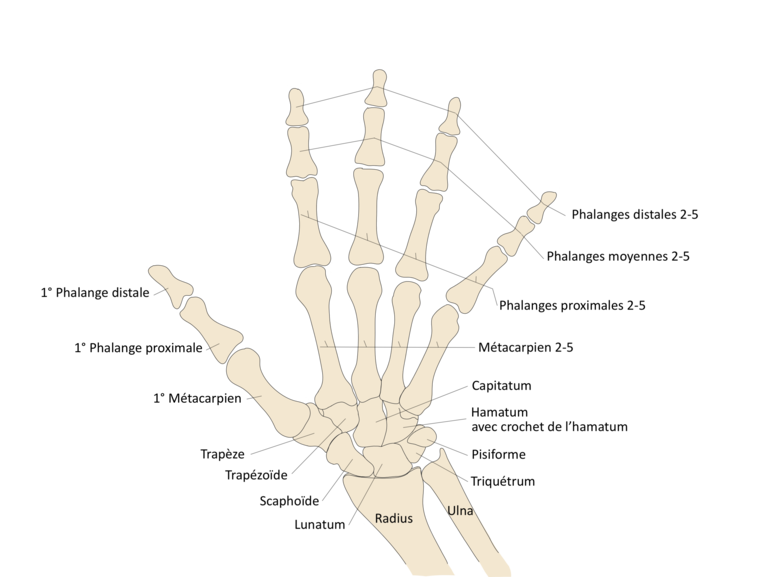 Au niveau osseux, on retrouve 27 os répartis entre le carpe, les métacarpiens et les phalanges. Il y a 8 os dans le carpe organisés sur 2 rangées, 5 métacarpiens et 14 phalanges. Bien évidemment, on n’oublie pas que les os de la main s’articulent avec l’ulna et le radius au niveau de l’articulation du poignet. Les os du carpe sont :