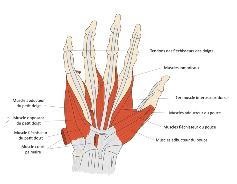 Les muscles intrinsèques sont répartis en loge thénar du côté radial, loge hypothénar du côté ulnaire et en loge moyenne entre les deux. Ces différentes loges sont séparées par différentes cloisons aponévrotiques sur la face palmaire. Les muscles intrinsèques sont :