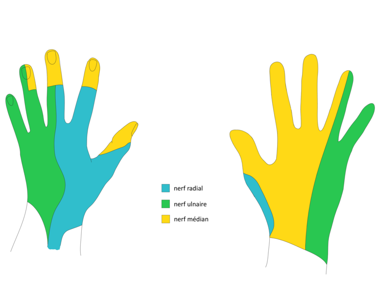 Au niveau nerveux, nous avons principalement 3 nerfs qui s’occupent de la sensibilité et de la motricité, il s’agit des nerfs médians, ulnaire et radial. Au niveau sensoriel, le côté palmaire médial est innervé par le n. ulnaire, le côté palmaire latéral par le n. médian, le côté dorsal médial par le n. ulnaire et le côté dorsal latéral par le n. radial.