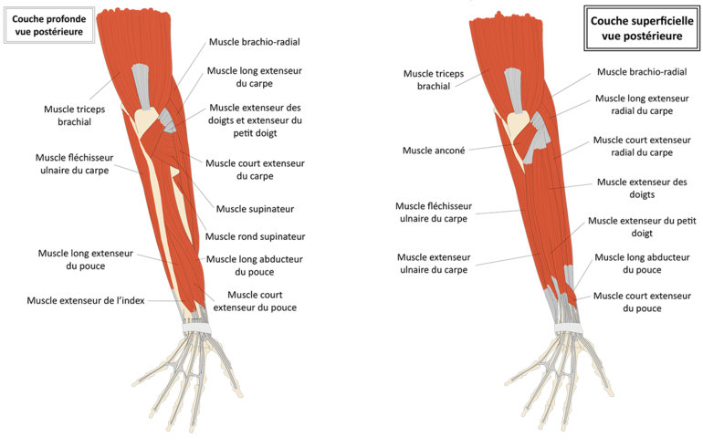 Les muscles extrinsèques sont répartis en deux loges au niveau de l’avant-bras. La loge antérieure contient les muscles fléchisseurs de la main et du poignet. La loge postérieure contient les muscles extenseurs de la main et du poignet. La loge des fléchisseurs contient :