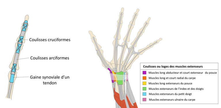Les tendons des muscles extenseurs ont un positionnement fixé contre la face dorsale des os du poignet, dans une position médio-latérale stabilisée, à la fois dans les mouvements d’inclinaison radiale et ulnaire du poignet. Les tendons des muscles extenseurs dans leurs gaines synoviales respectives sont maintenus contre le squelette grâce à six coulisses ostéofibreuses indépendantes, à la face postérieure des os du poignet. Le rétinaculum des extenseurs assure la contention de l’ensemble de ces coulisses et gaines synoviales à la face dorsale du poignet.