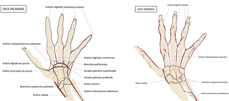Au niveau vasculaire, les aa. radial et ulnaire vascularisent toute la main. Elles forment les arcades palmaires superficielles, profondes et l’arcade dorsale de la main. Ces différentes arcades s’anastomosent et donnent les aa. interdigitales puis les aa. digitales propres. L’artère ulnaire passe dans le canal de Guyon (canal au-dessus du rétinaculum des fléchisseurs au niveau du bord médial de la main) accompagné du nerf ulnaire. L’artère radiale plonge dans la tabatière anatomique par la face postérieure de la base du 1er métacarpien et rejoint le plan profond palmaire par le 1er espace interdigital.