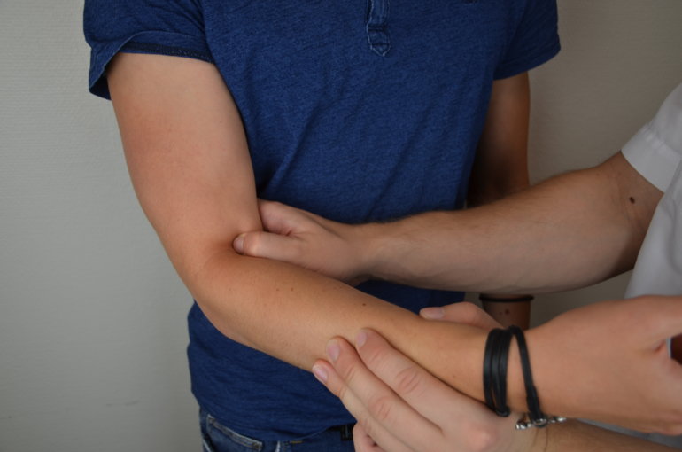 La palpation se fait de manière symétrique en palpant systématiquement les différentes structures anatomiques. On palpera l’olécrane, l’épicondyle médiale, l’épicondyle latérale, l’insertion du biceps brachial, l’insertion du triceps.