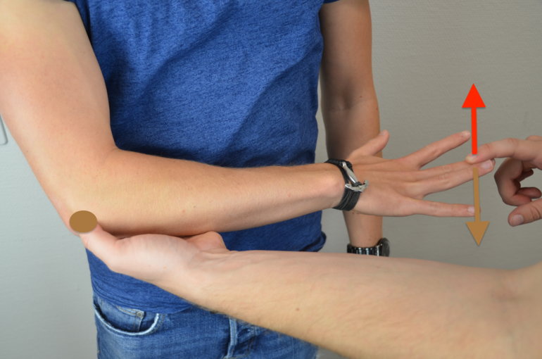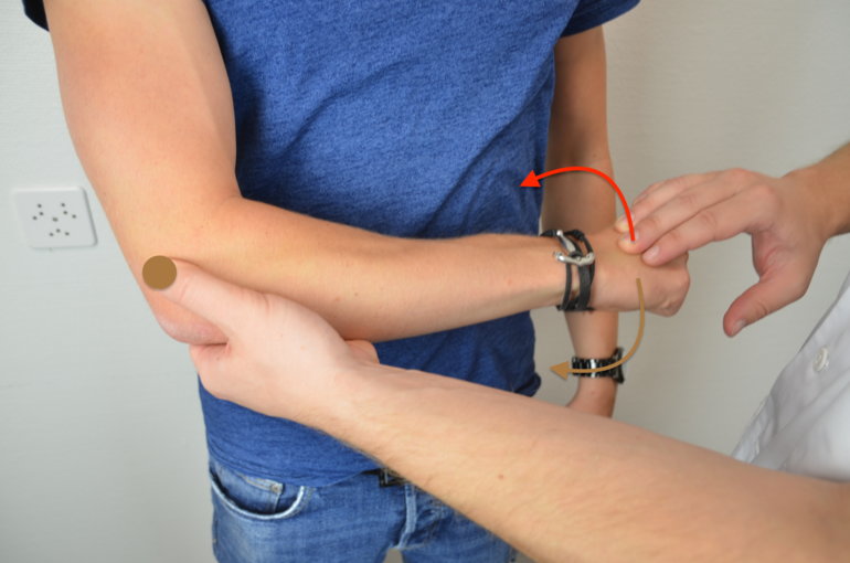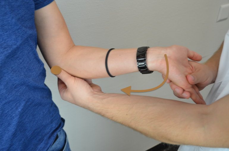 L’examinateur palpe l’épicondyle latéral tout en amenant le poignet en pronation, flexion et le coude en extension. C’est ce qu’on appelle le test de Mill.