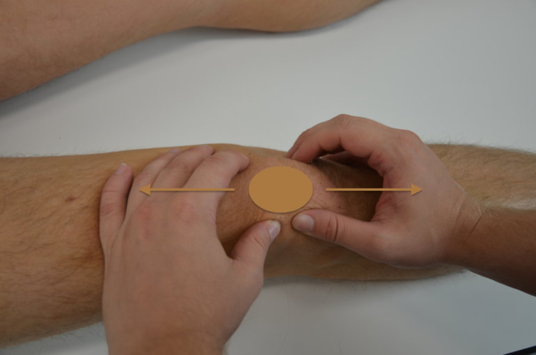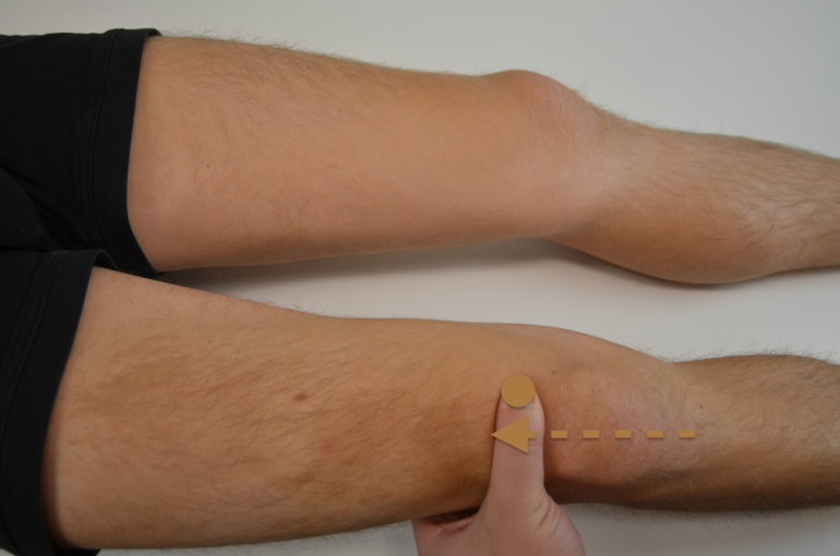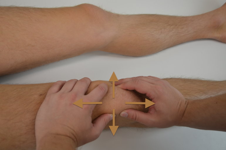 On saisit la patella en position de repos et on amène celle-ci dans une position médiale. C’est ce qu’on appelle le « glide test » ou le test de mobilité patellaire.