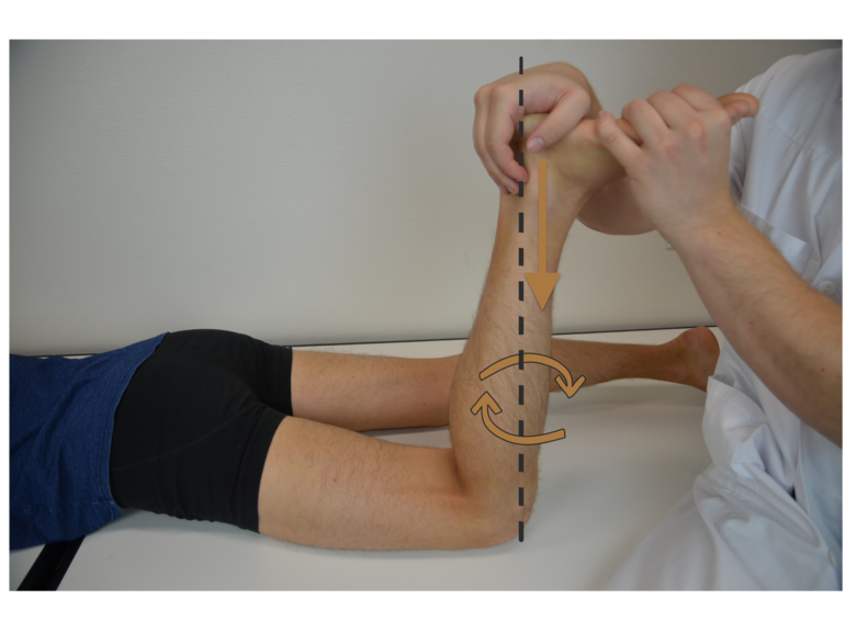 On met le patient en décubitus ventral avec la jambe à 90° de flexion. Puis on appuie sur le talon dans l’axe de la jambe en effectuant des rotations internes et externes afin de mettre en contrainte respectivement le ménisque interne et externe.