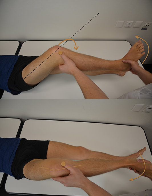 On met la jambe du patient en légère flexion, puis en rotation interne. On place l’autre main au niveau de l’interligne articulaire afin de palper celle-ci. Puis on effectue une flexion du genou. On refait la même chose mais cette fois-ci avec la jambe en rotation externe. C’est ce qu’on appelle le test de McMurray afin de tester respectivement l’intégrité du ménisque externe et du ménisque interne.