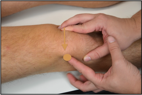 On palpe l’interligne articulaire avec un genou fléchi à 90 °. On provoque une douleur à la palpation de l’interligne articulaire. On pensera à une lésion méniscale interne ou externe.