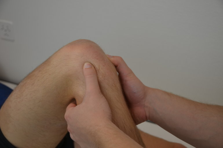 On palpe les facettes postérieures interne et externe de la rotule en poussant respectivement la rotule du côté médial et latéral.