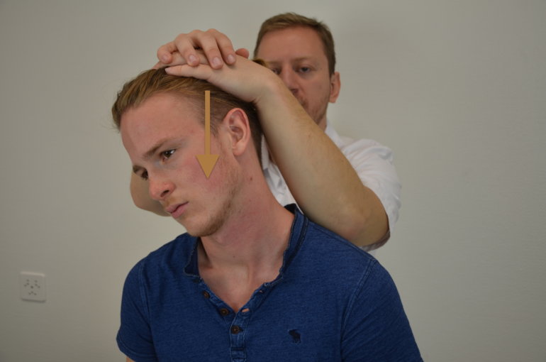 On positionne le patient en position assise. On met la tête du patient en flexion antérieure, flexion latérale et rotation du côté supposément atteint, puis on exerce une pression sur la tête contre le bas.