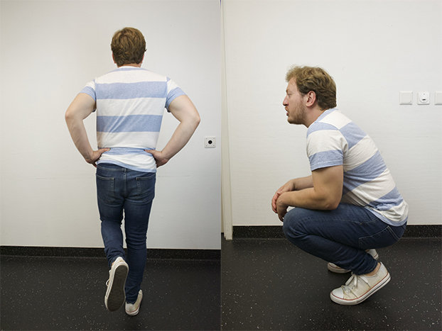 On évalue ensuite la force du segment proximal du membre inférieur. On demande au patient de s’accroupir. On constate une incapacité. On pense à une insuffisance musculaire. On la retrouve dans des neuropathies et myopathies, etc.