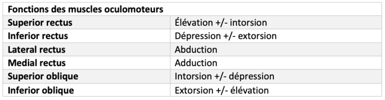 On teste ensuite l’oculomotricité avec le nerf oculomoteur (III) – nerf trochléaire (IV) – nerf abducens (VI). Le nerf III innerve le muscle releveur de la paupière, le muscle droit inférieur, l’oblique inférieur, le droit médial, le droit supérieur et le muscle dilatateur de la pupille. Le nerf IV innerve le muscle oblique supérieur. Le nerf VI innerve le muscle droit latéral.