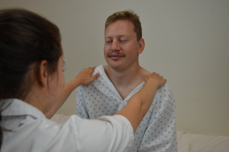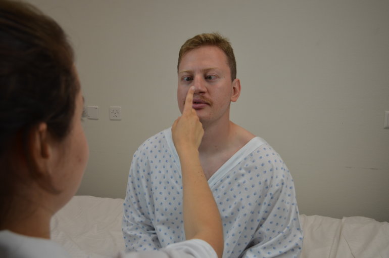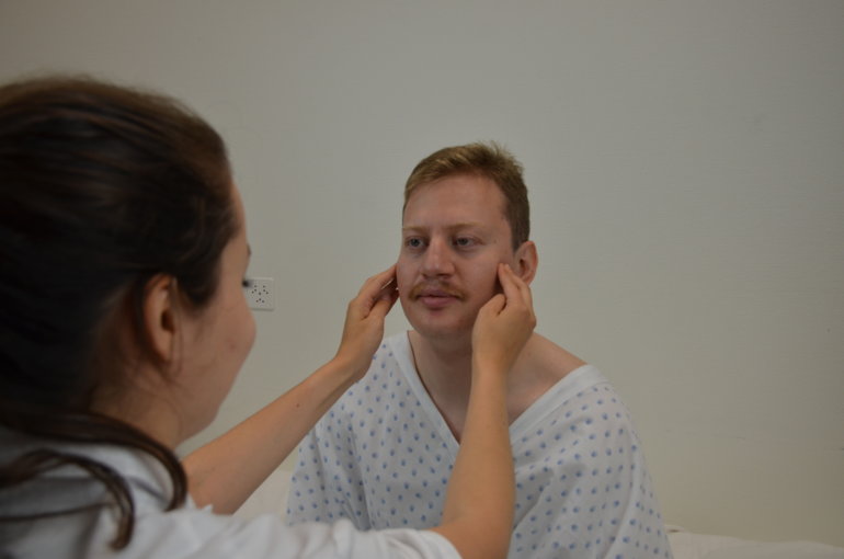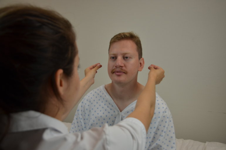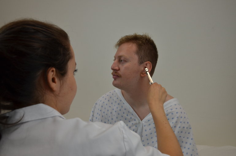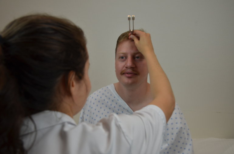 On débute par un examen de l’audition. On réalise premièrement un dépistage grossier. On frotte les doigts les uns contre les autres à proximité du pavillon gauche du patient puis à droite et finalement simultanément à gauche et droite. On constate une surdité bilatérale ou unilatérale. On identifie une asymétrie d’audition, on pense à une surdité unilatérale, une hypoacousie bilatérale ou unilatérale. On pense à une surdité de transmission ou de perception.