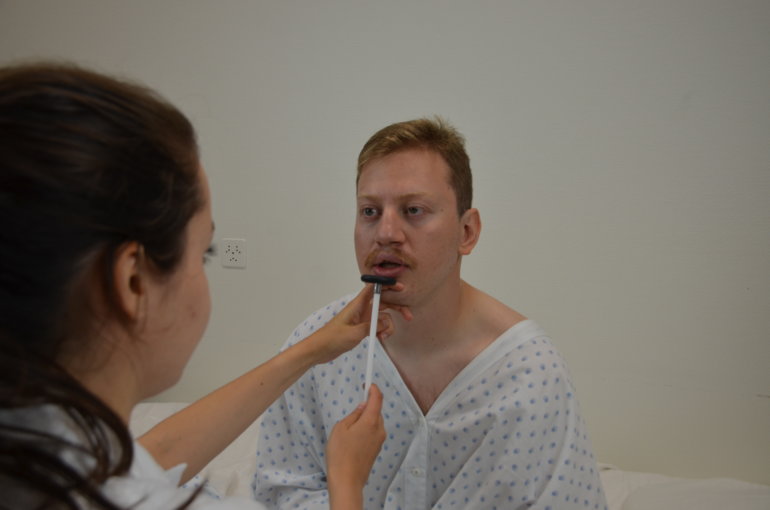 On teste ensuite le nerf glosso-pharyngé (IX), responsable de la sensibilité somesthésique et gustative du 1/3 postérieur de la langue, la sensibilité de l’oreille moyenne, de la trompe d’eustache, de la conque, du méat acoustique externe et du tympan. Il médie également la partie afférente du réflexe émétique, les afférences des glomus carotidiens. Il est responsable de l’innervation salivaire parotidienne et faiblement de la motricité du pharynx.