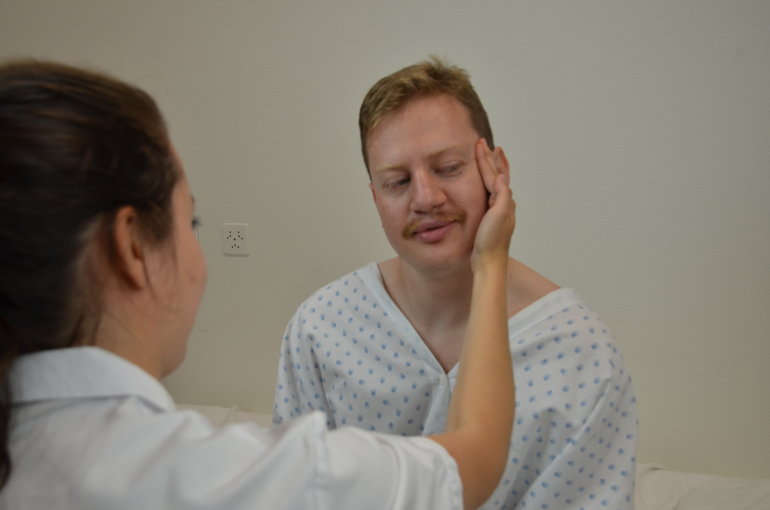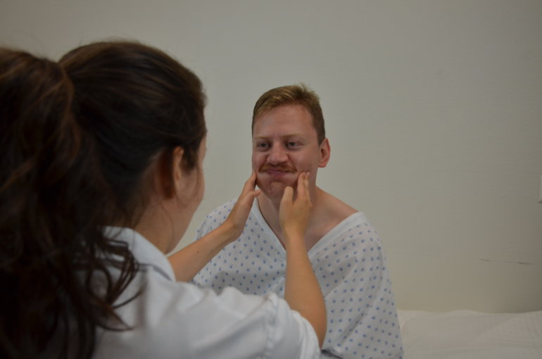 Pour ce faire, on demande au patient de froncer puis hausser les sourcils, de fermer fort les yeux, de gonfler les joues, de sourire. On observe une asymétrie de contraction avec un déficit unilatéral du front et une incapacité à fermer les yeux, sans dissociation automatico-volontaire. On pense à une atteinte périphérique. En cas d’atteinte faible, les cils de l’œil du côté paralysé vont paraître plus longs en raison d’une moindre fermeture. On parle du signe des cils de Souques.