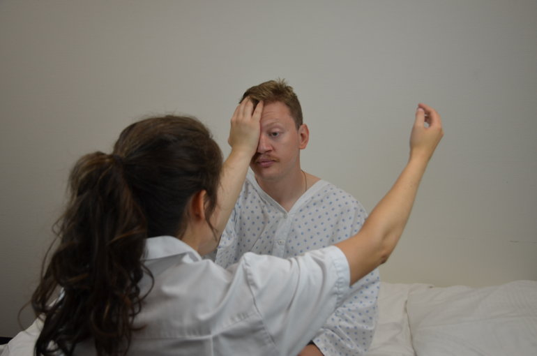 On réalise ensuite un examen de la convergence après avoir testé la poursuite. On demande au patient de suivre du regard notre doigt, que l’on rapproche lentement de son nez. On observe un myosis et une adduction bilatéralement. Il s’agit du réflexe d’accommodation-convergence-myosis. On observe un déficit. On pense à une atteinte mésencéphalique, une insuffisance musculaire, etc. Comme mentionné précédemment, ce réflexe est préservé dans l’ophtalmoplégie internucléaire et une atteinte de l’aire prétectale, dissociation lumière-convergence.