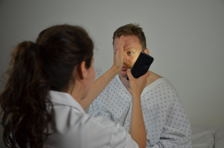 On poursuit par un examen de la réactivité des pupilles pour tester l’intégrité du réflexe photomoteur médié par le nerf II pour la partie afférente et III pour la partie efférente. On débute en évaluant avec une lampe le réflexe photomoteur direct de chaque pupille, c’est-à-dire réponse de la pupille illuminée.