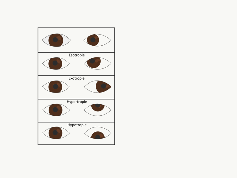 On observe ensuite le regard primaire. On observe un mauvais alignement des yeux avec un reflet cornéen symétrique. On pense à un pseudostrabisme. On observe un mauvais alignement des yeux avec un reflet cornéen asymétrique. On pense à une parésie des nerfs oculomoteurs d’origine centrale ou périphérique, si l’alignement change par la suite au regard. On pense à un strabisme dans le cas inverse. Un strabisme peut être masqué en vision binoculaire, on peut le démasquer en cachant alternativement un œil et l’autre à la recherche de mouvements oculaires correcteurs. On observe un strabisme vertical, on parle de skew deviation qui oriente vers une atteinte centrale.