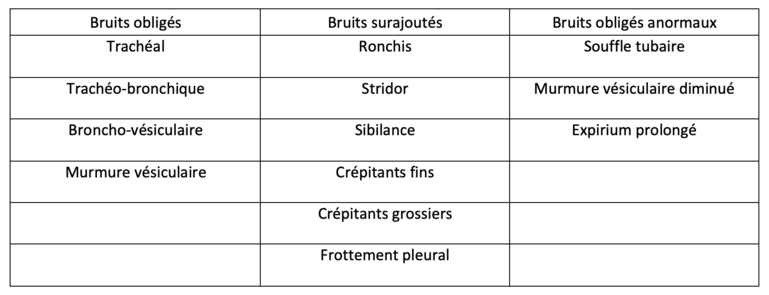 On demande au patient de respirer un peu plus fort avec la bouche ouverte afin de faciliter l’auscultation. L’auscultation se fait systématiquement sur un cycle complet comprenant inspiration et expiration. L’inspiration a une durée plus importante que l’expiration en situation physiologique. On décrit deux types de bruits, ceux respiratoires obligés et ceux surajoutés, adventitiels.
