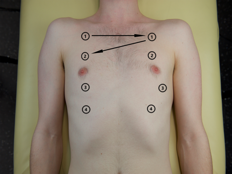 On ausculte d’abord la trachée en posant la cloche du stéthoscope sous le larynx. On entend un bruit aigu rauque et intense perçu de façon égale tant à l’inspiration qu’à l’expiration. Il s’agit du bruit trachéal, physiologique.