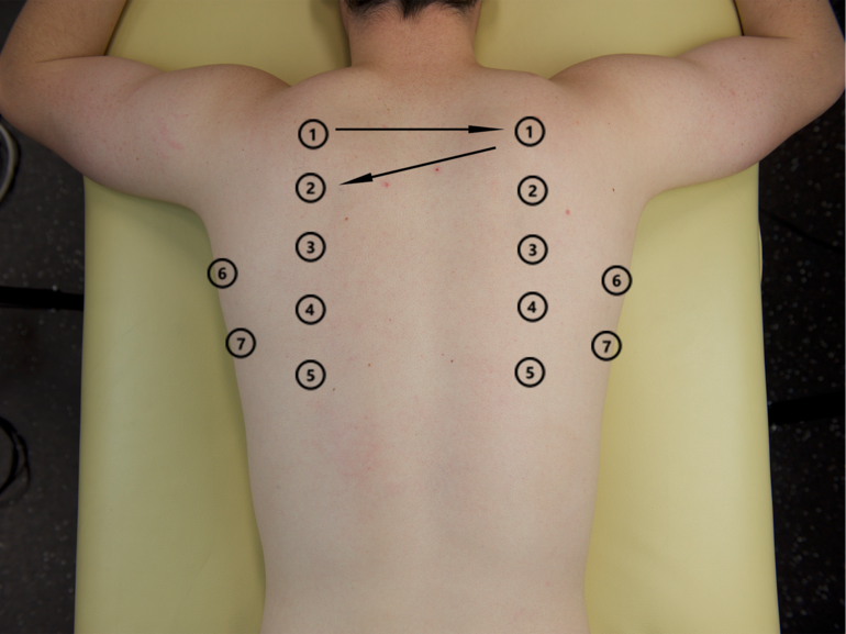 On ausculte ensuite les plages pulmonaires (parenchyme) avec la membrane du stéthoscope en comparant le côté droit et gauche à chaque niveau. On effectue une auscultation des quatre niveaux antérieurs, deux latéraux et cinq postérieurs, afin de couvrir toutes les aires pulmonaires.